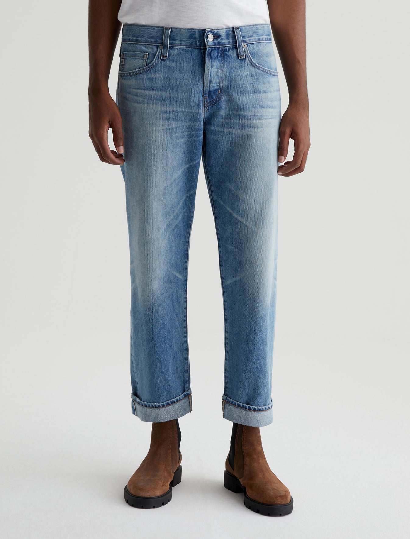 Kace is a modern straight-leg jean, updated here with a button fly, cropped inseams, and an AG-ed™ medium indigo wash with a 16-year fade. Anchored by a mid-rise waist, the style has a relaxed fit from hip to the knee before tapering to a cuffed leg opening. These 5-pocket men's jeans are designed in Robechetto Rigid Selvage Denim from Italy and feature subtle wear at the edges for a naturally lived-in character.