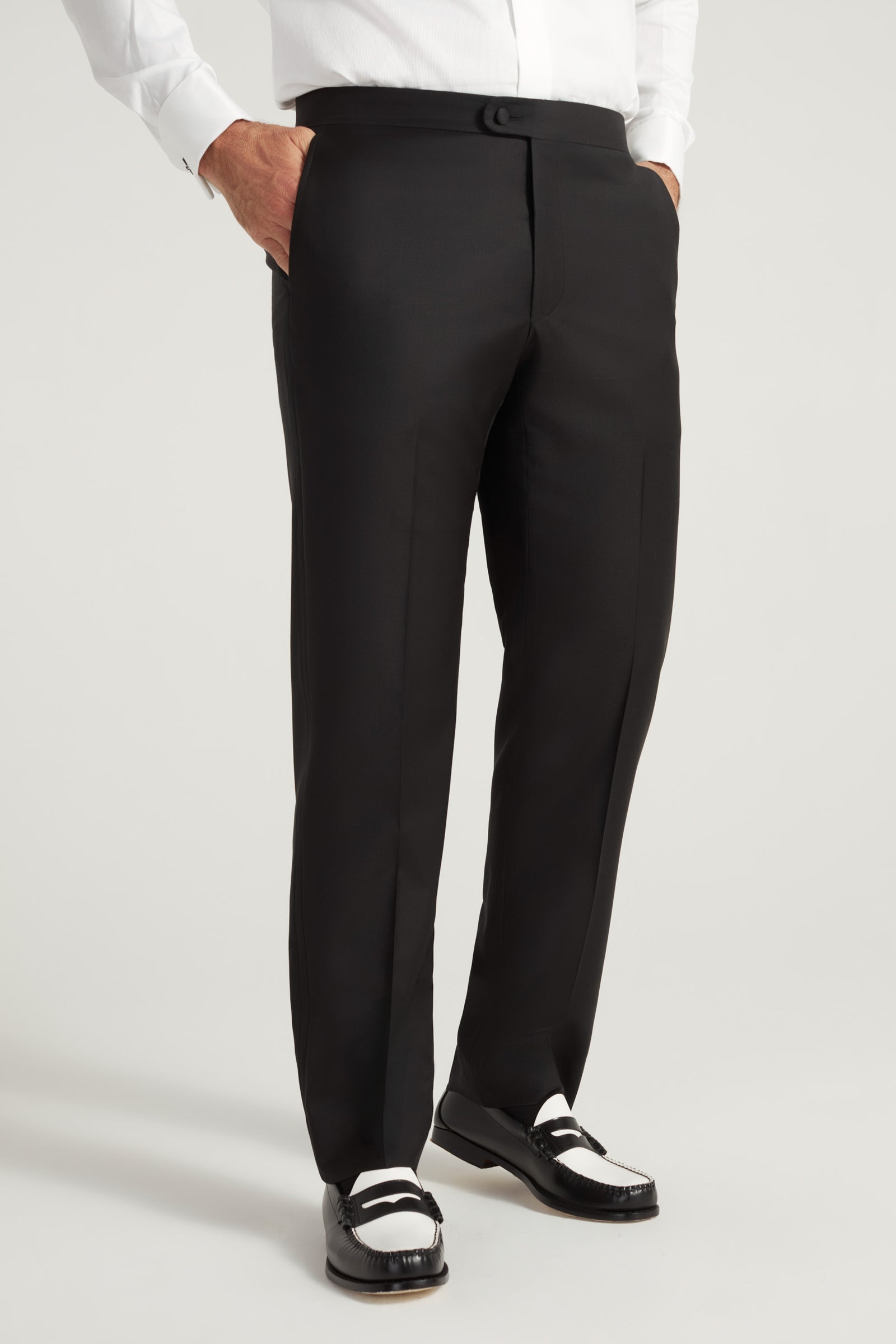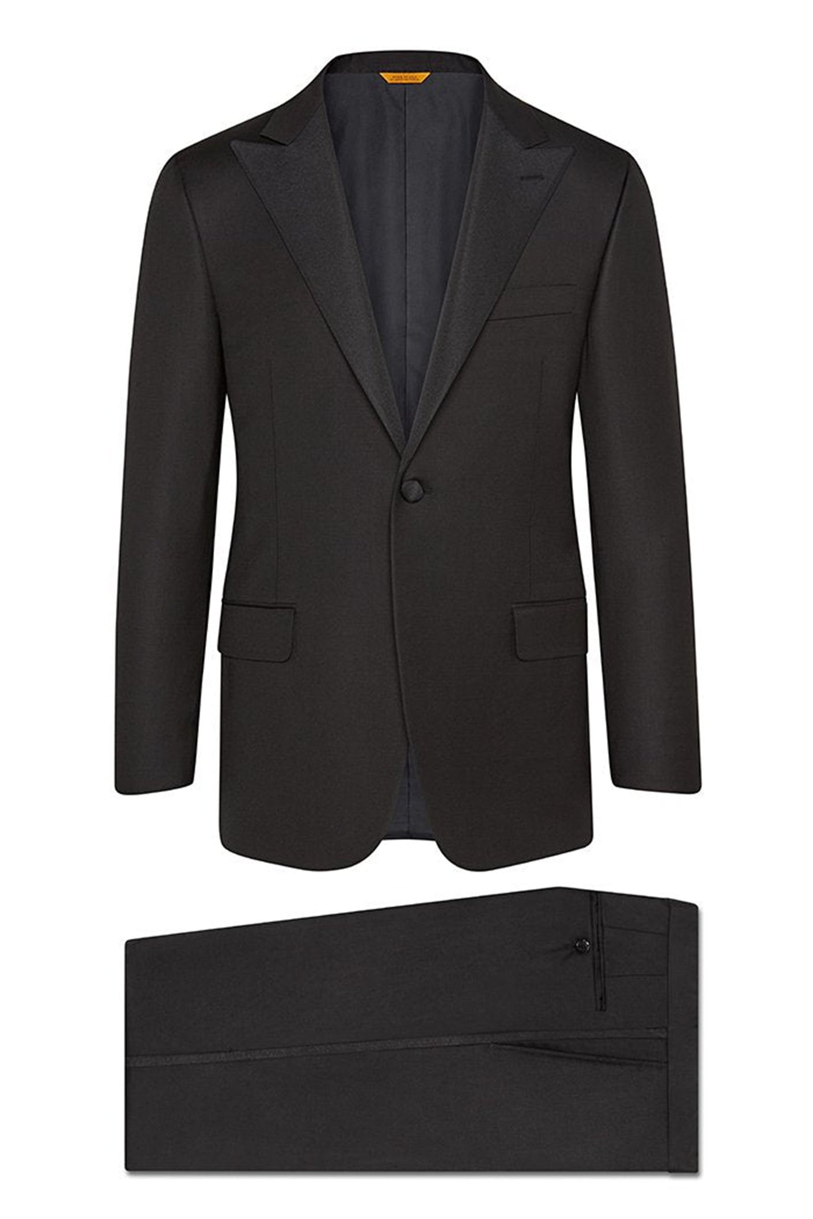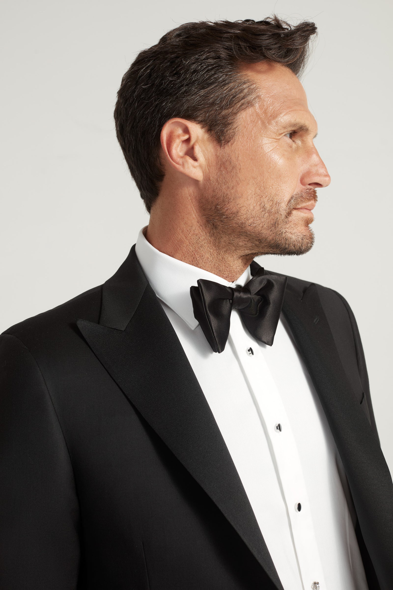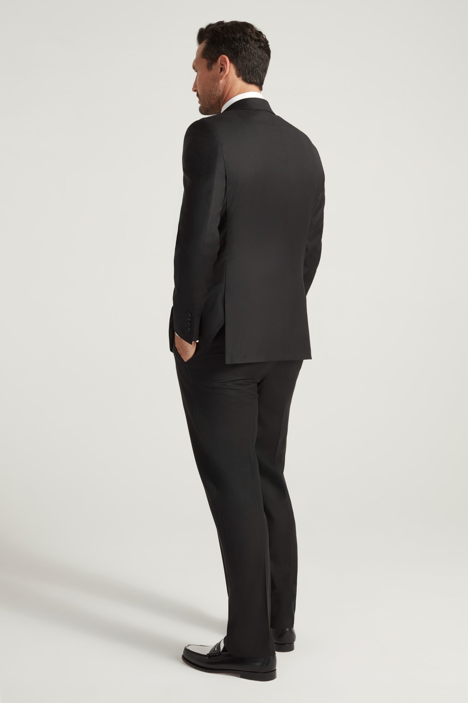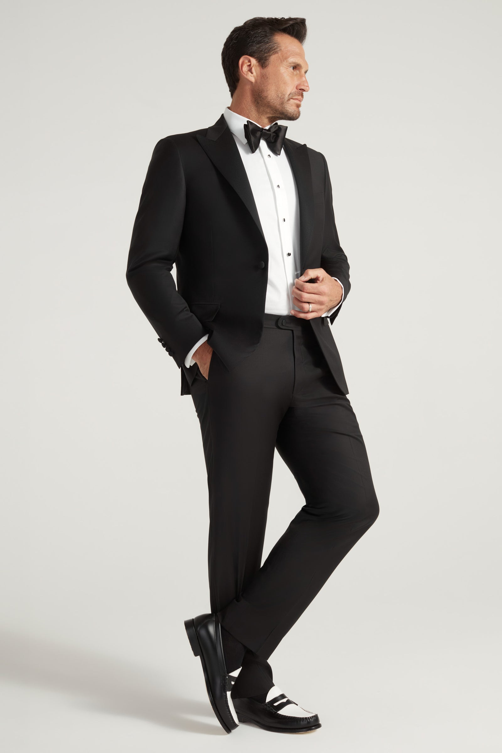 Black Peak Lapel Infinity Tuxedo features expert tailoring of luxurious super 150's Honey Way Super 150's wool. The peak lapels are faced with black grosgrain. This mill has developed some of the finest cloth in Biella, Italy for over a century. Cut in our most popular B fit.