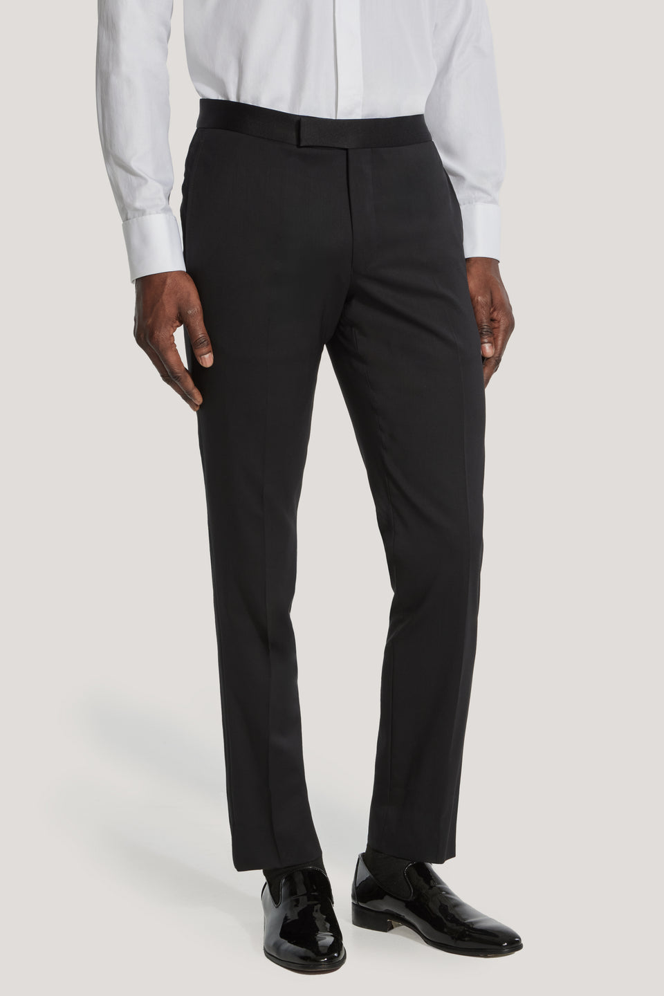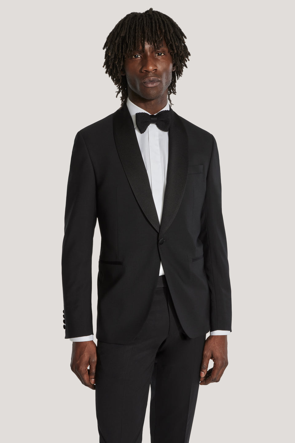 Perfect for black-tie events or evening soirées, this classic black shawl collar tuxedo exudes timeless elegance. Crafted from luxurious Super 130's wool with sleek black satin trim, it features a sophisticated shawl lapel and a modern, tailored silhouette. The ensemble is completed with matching tuxedo pants, featuring a satin side stripe and a refined fit for a polished, formal look.