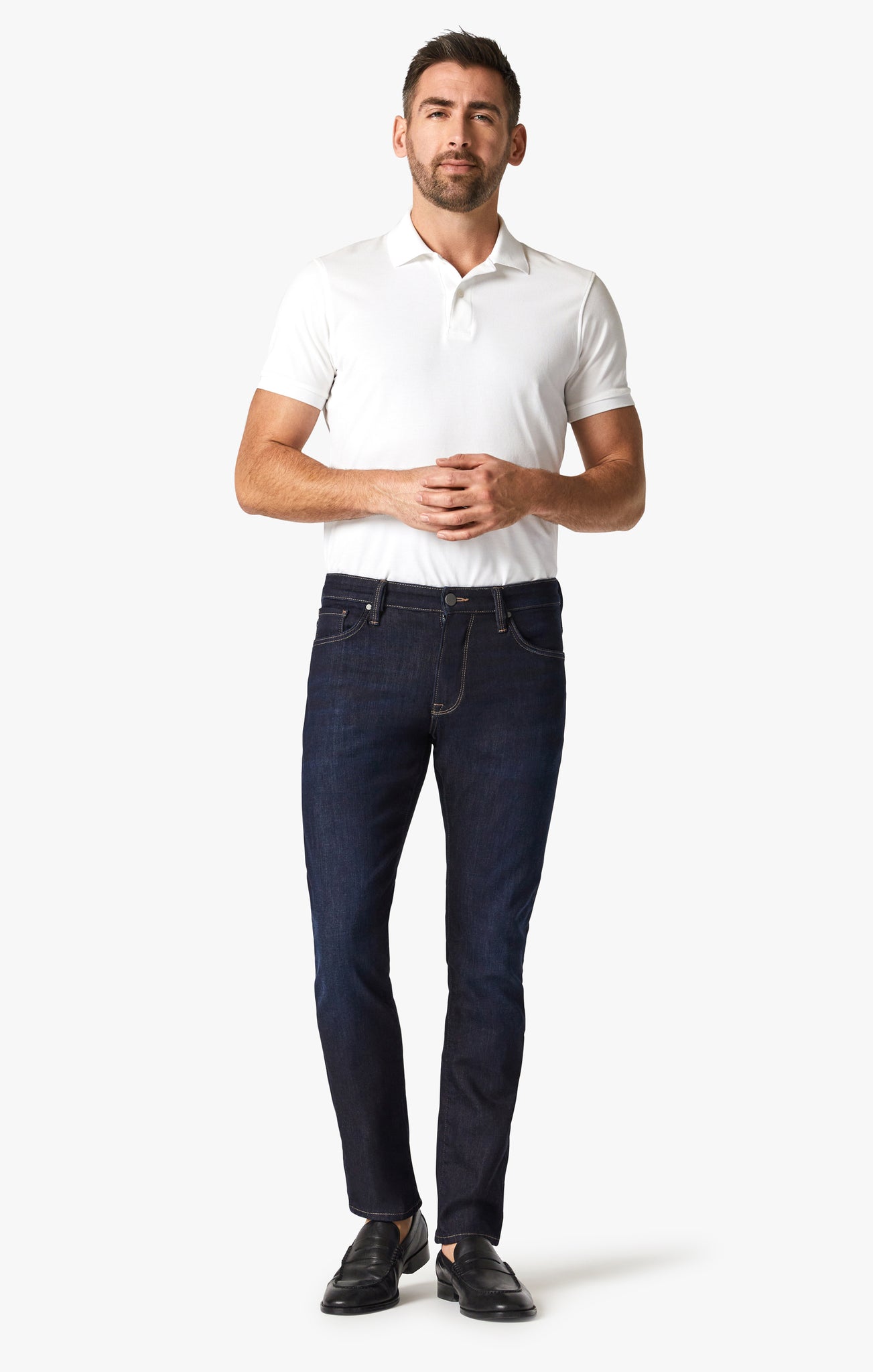 Luxurious comfort, a sleek dark rinse wash, and a streamlined fit all combine into one sophisticated and elegant jean that’s sure to be your go-to pair. These modern slim leg jeans taper below the knee for a fit that’s perfectly roomy yet never slouchy. Designed with supremely soft and stretchy fabric that’s inspired by durable selvedge denim, this pair has a lightweight structure and timeless appearance that makes it a closet staple in every way.