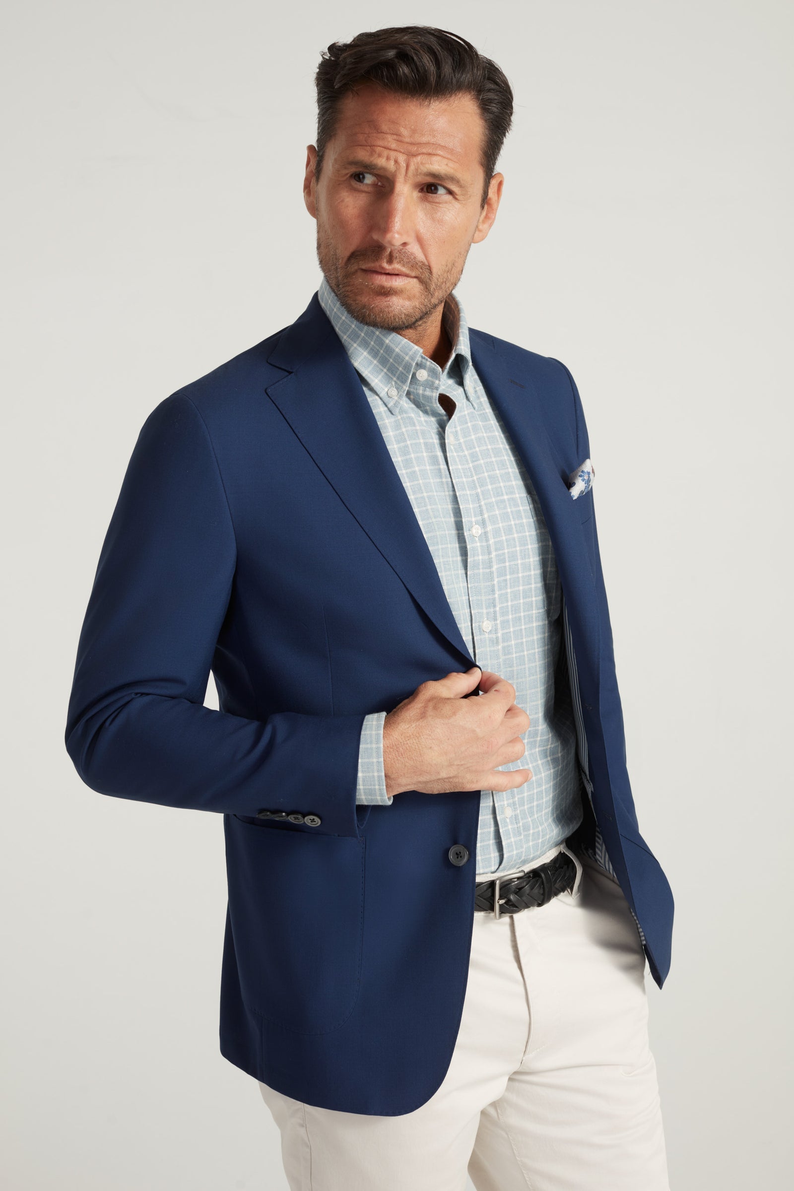 Crafted from luxurious Super 150s wool, this poplin blazer combines lightweight comfort with exceptional anti-wrinkle performance, making it an ideal choice for summer. Its weightless construction offers effortless elegance, ensuring ease of wear and perfect for travel. The vibrant New Blue color adds a distinctive and sophisticated touch, bringing a fresh and lively hue to your seasonal wardrobe. Designed for both style and practicality, this blazer is ¼ lined with a bengal stripe as a great feature.