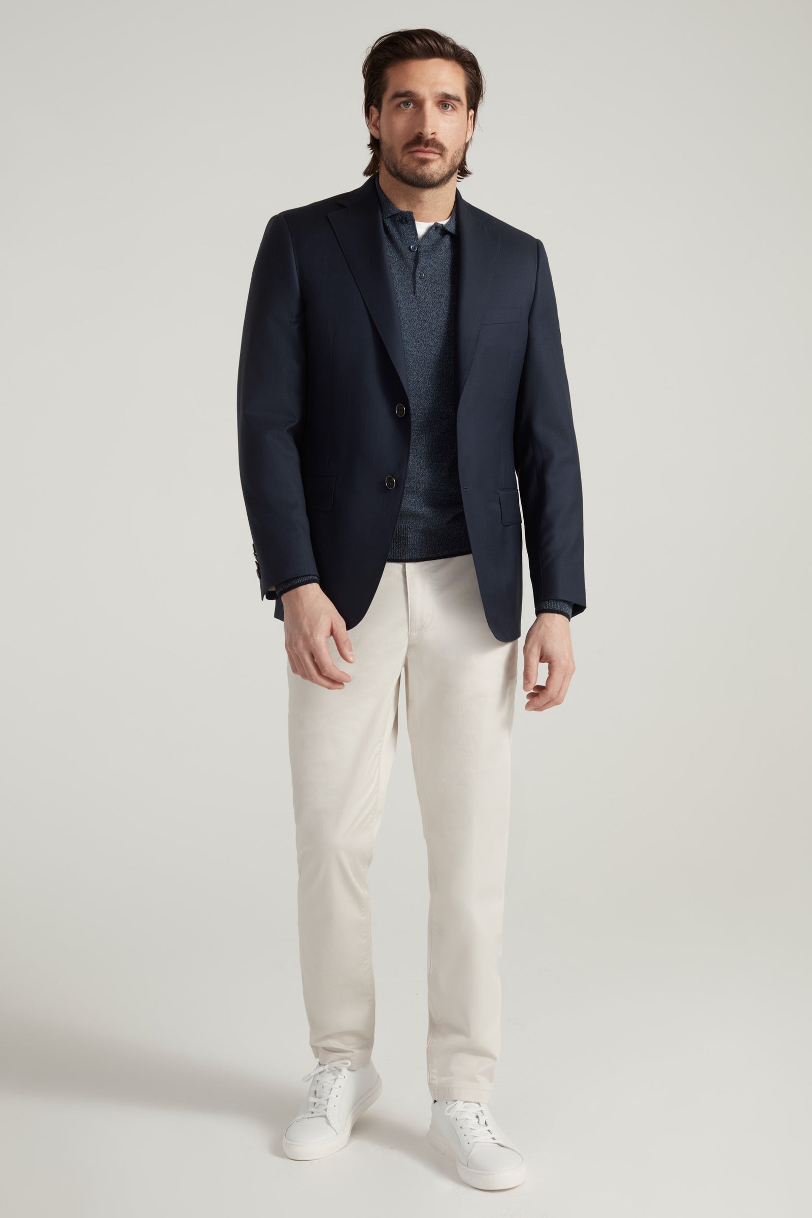 Crafted from innovative Super 130's Honey Way fabric and expertly woven by the renowned Tallia Di Delfino mill, our Navy Honey Way Serge blazer boasts a luxurious, eco-conscious process that elevates the fabric's luminosity and softness. Available in both Bennet and Garner fits, this blazer is the perfect addition to your wardrobe.
