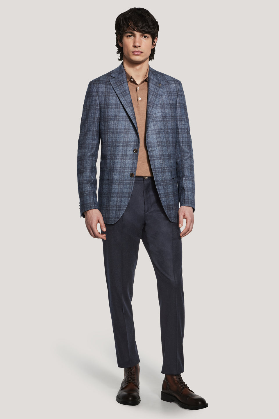 Crafted from pure wool, this single breasted two button Midland blazer features a striking medium blue and brown plaid, enhanced by a subtly milled finish for a refined yet casual look. Designed for effortless versatility, its unconstructed, half-lined interior ensures lightweight comfort and a relaxed drape, perfect for layering in any season. The classic notch lapel, lower flap pockets, an upper welt breast pocket, and interior pockets blend timeless tailoring with modern functionality, while inserted sleeves with fine pic-stitching highlight superior craftsmanship. A go-to piece for both smart and casual styling, this blazer brings understated elegance to any wardrobe.